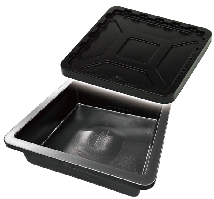 スタティックインターセプト材を市販のプラボックスに合わせて真空成型したインナーボックス。通い箱として使用することができ、箱の中に製品と乾燥剤を入れることで防錆対策を行うことができます。